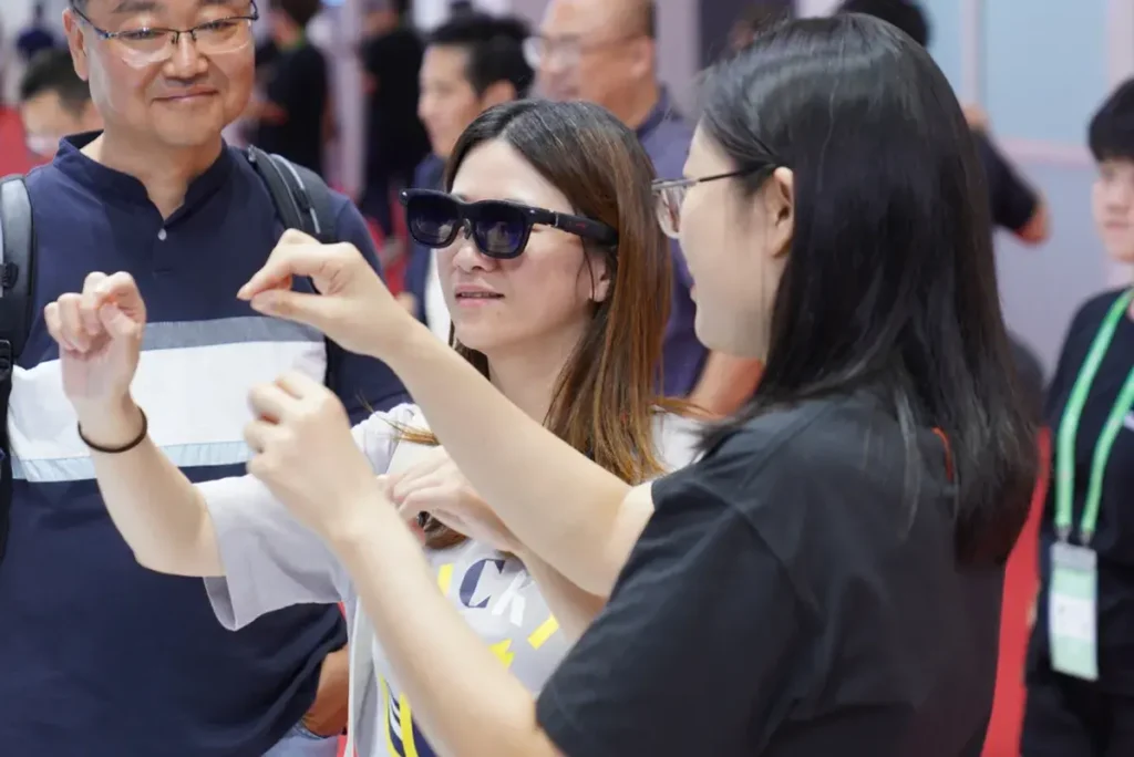 Un visitante experimenta con un par de gafas inteligentes durante la tercera Exposición Internacional de la Cadena de Suministro de China (CISCE) en Beijing, capital de China.