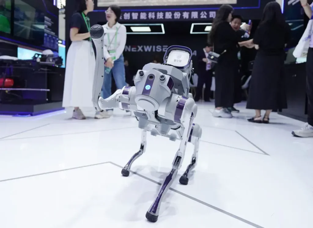 Un perro robot es fotografiado en el área de la Cadena de Tecnología Digital durante la tercera Exposición Internacional de la Cadena de Suministro de China (CISCE) en Beijing, capital de China.