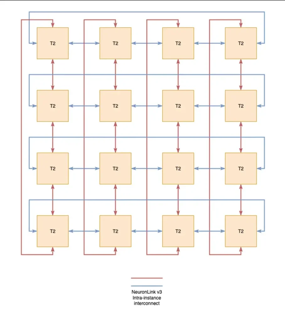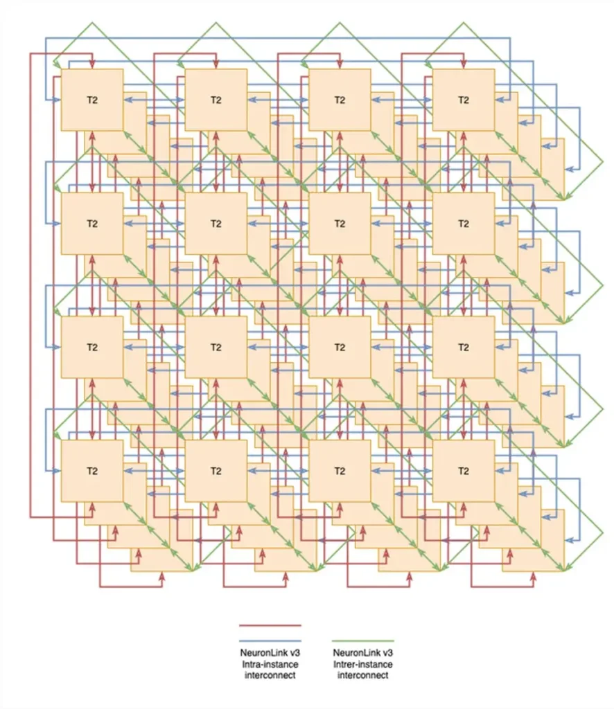Según la documentación de Amazon, el ancho de banda entre instancias que proporciona NeuronLink entre las instancias Trn2 es bastante menor, con 256 GB/s de ancho de banda por chip.