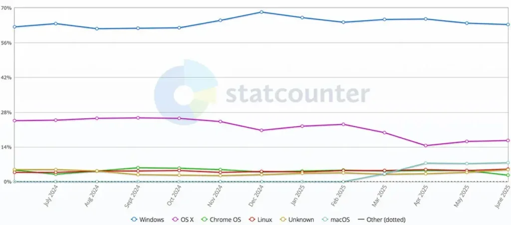 Según StatCounter, el sitio web de análisis de tráfico web, el uso del escritorio Linux en EE.UU. alcanzó el 5,03% del mercado de sistemas operativos, con un uso mundial de aproximadamente el 4,1% en junio de 2025.