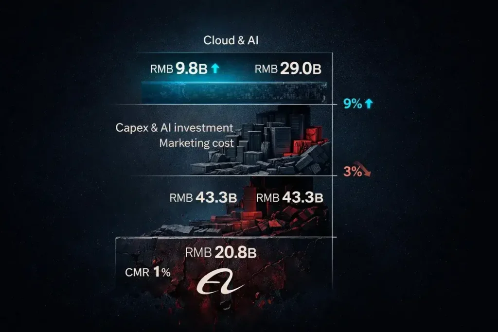 El EBITA ajustado de la nube alcanzó los 3.900 millones de RMB, un 25% más, con márgenes estables en el 9%. En un trimestre donde casi todos los demás sectores se deterioraron, la nube logró un mayor crecimiento de los ingresos y mayores beneficios.