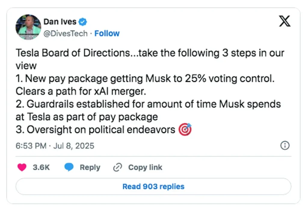 La publicación de Ives se produjo tras una caída de casi el 7% en las acciones de Tesla el lunes, que eliminó 68.000 millones de dólares de capitalización bursátil. Ives exigió a la junta directiva de Tesla que creara un nuevo paquete salarial para Musk que le otorgara un 25% de control de voto y allanara el camino para fusionarse con xAI, establecer límites sobre el tiempo que Musk puede dedicar a Tesla y supervisar las iniciativas políticas.