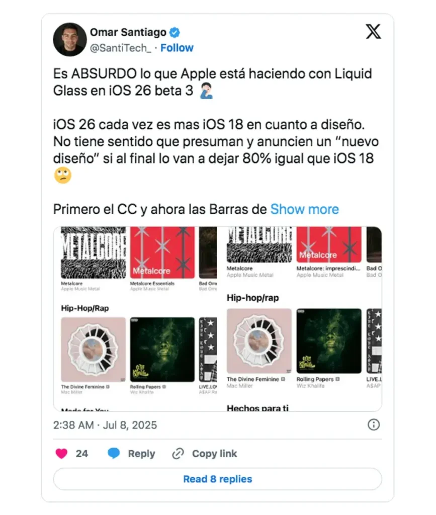 Si bien se podría decir que los cambios facilitan la lectura de las funciones, algunos usuarios se quejan de que Apple ha ido demasiado lejos en la dirección opuesta al volver a una estética más parecida a la de «vidrio esmerilado».