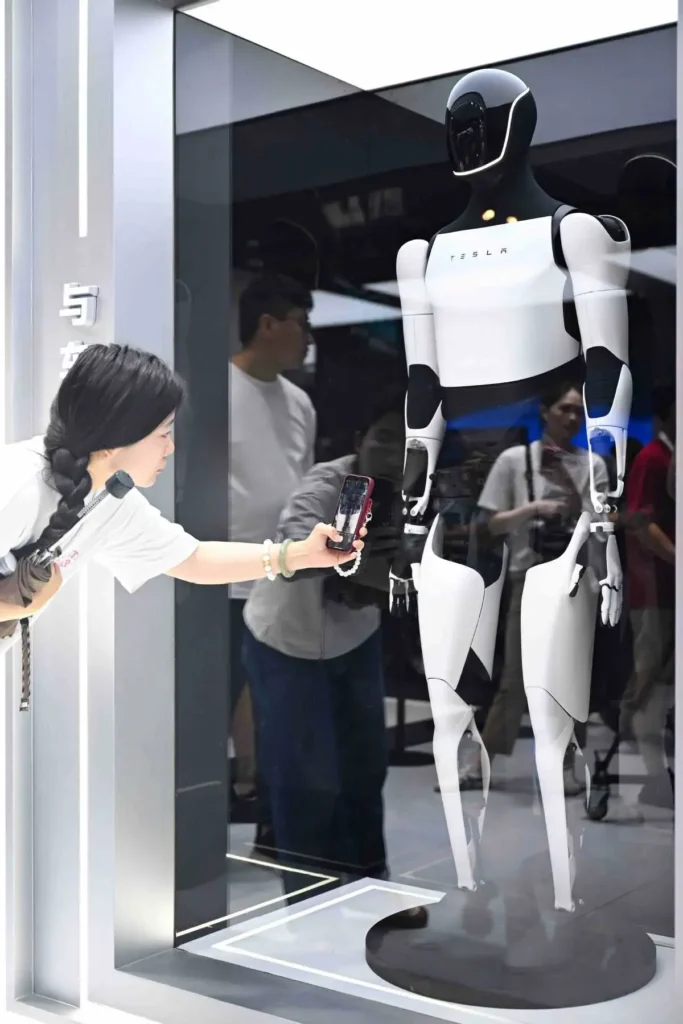 Un visitante toma fotografías de un robot humanoide de Tesla en el área de exhibición de la Conferencia Mundial de IA 2025 y Reunión de Alto Nivel sobre Gobernanza Global de IA en Shanghái, este de China.