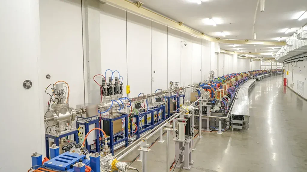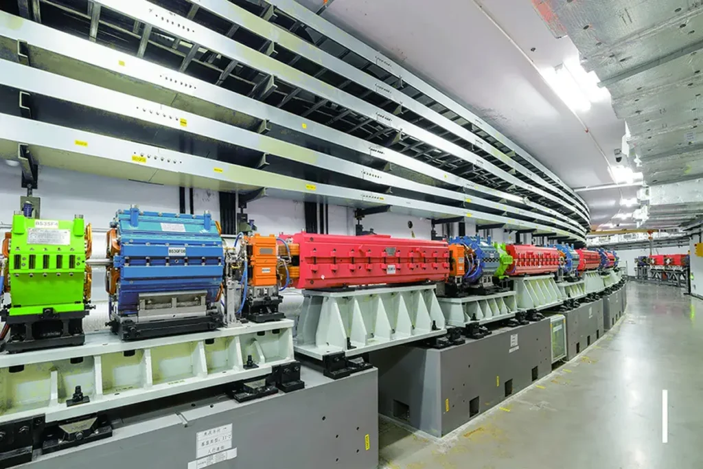 El anillo de almacenamiento de la instalación está equipado con 1.776 imanes de varios colores, que controlan el haz de electrones para que funcione de forma estable a altas velocidades dentro de una pista de vacío del ancho de un pulgar.