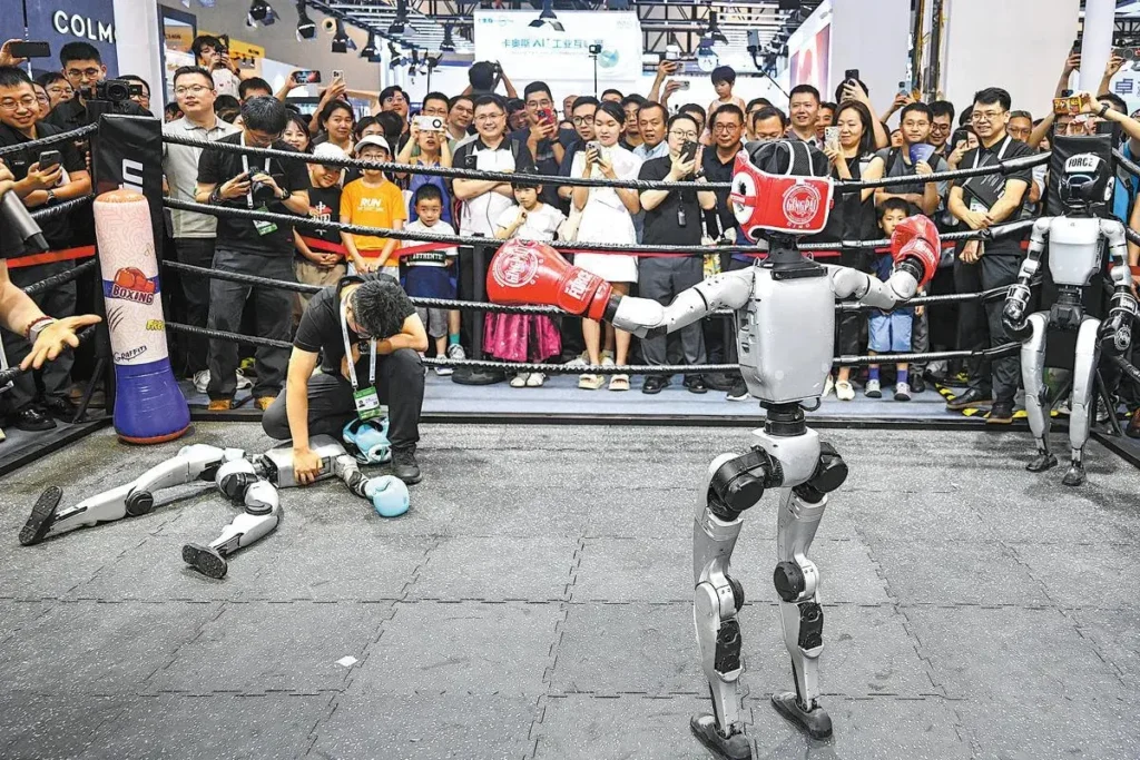 La gente se reúne y toma fotos de dos robots de combate boxeando durante la Conferencia Mundial de IA 2025, el 26 de julio.