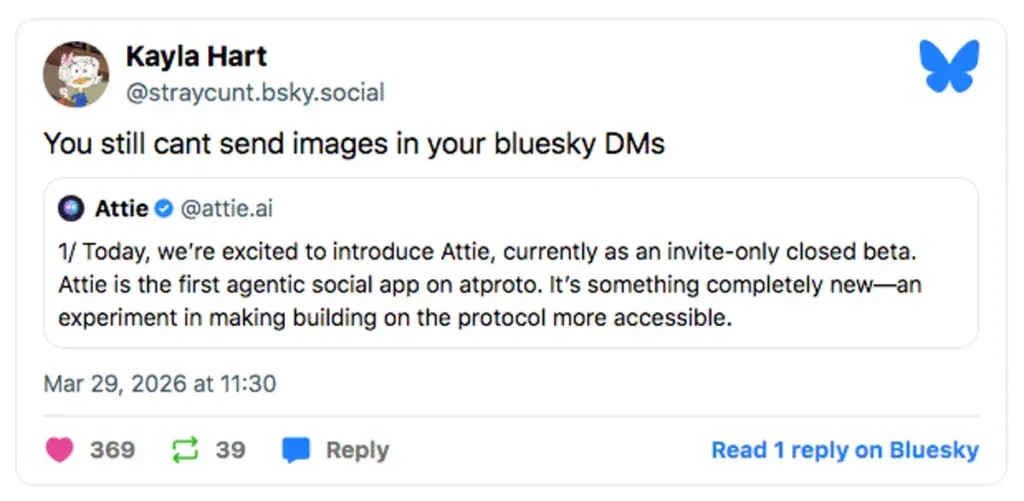 Otros han criticado las prioridades de producto de Bluesky, señalando que la plataforma aún carece de funciones básicas muy solicitadas, como el envío de imágenes por mensaje directo.