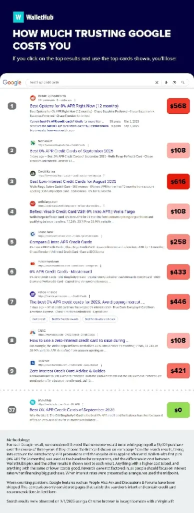 Un estudio de WalletHub reveló que confiar en los primeros resultados de búsqueda de Google para tarjetas de crédito con una TAE del 0% puede costarles cientos de dólares a los consumidores.