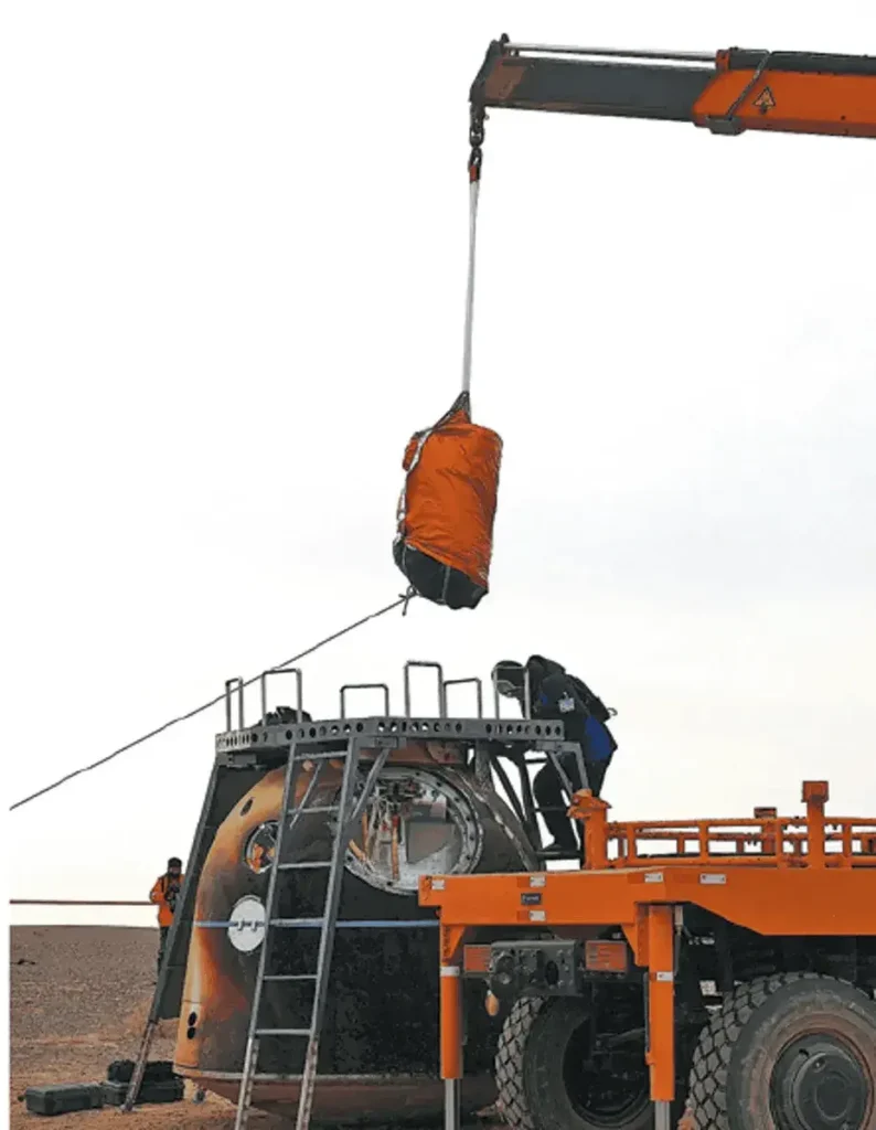 El traje espacial fue extraído de la cápsula de retorno con una grúa tras su aterrizaje seguro el lunes.