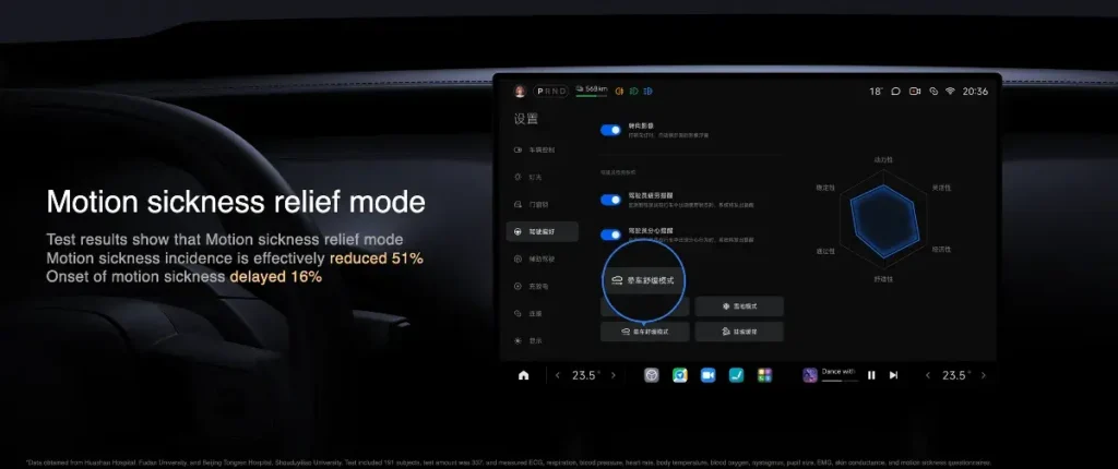 Finalmente, para quienes son propensos al mareo por movimiento, Xiaomi ha colaborado con el Hospital Huashan y el Hospital Tongren de Beijing para desarrollar conjuntamente un Modo de Alivio del Mareo por Movimiento. Tras estudiar la frecuencia cardíaca, el movimiento ocular, la conductancia cutánea y otras respuestas, el chasis del Xiaomi YU7 está ajustado con precisión para suavizar el cabeceo, el balanceo y los baches. La aceleración se siente tan estable como un tren de alta velocidad, el frenado regenerativo está calibrado para minimizar las sacudidas y el balanceo de la carrocería se reduce aún más gracias a la suspensión adaptativa. En las pruebas, esto redujo la incidencia del mareo por movimiento en un 51% y retrasó su aparición en un 16%.