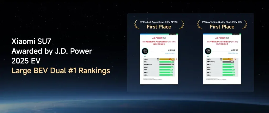 Algunos competidores de la industria afirman: «La seguridad es el mayor lujo». Sin embargo, nosotros creemos que la seguridad es el requisito fundamental, la base y el núcleo de todo. Desde su lanzamiento, el Xiaomi SU7 ha obtenido las mejores calificaciones en pruebas de seguridad de prestigio y ha obtenido un amplio reconocimiento, incluyendo su nombramiento como «Auto del Año» por los medios de comunicación. Recibió una calificación A según los nuevos estándares C-IASI 3G+ (la más alta entre los sedanes hasta la fecha) y cinco estrellas según el C-NCAP actualizado, alcanzando una puntuación líder en su categoría. En el informe «Vehículos de Nueva Energía 2025» de J.D. Power, el Xiaomi SU7 también se posicionó primero en dos categorías clave dentro del segmento de vehículos eléctricos de gran tamaño.